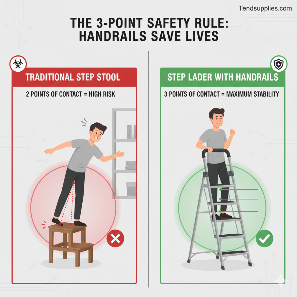 - The Problem with Standard Stools: A regular step stool provides no vertical support beyond the top platform. When you reach up or to the side, you invariably shift your center of gravity outside the ladder’s base, relying solely on your core balance to prevent a tip or slip.