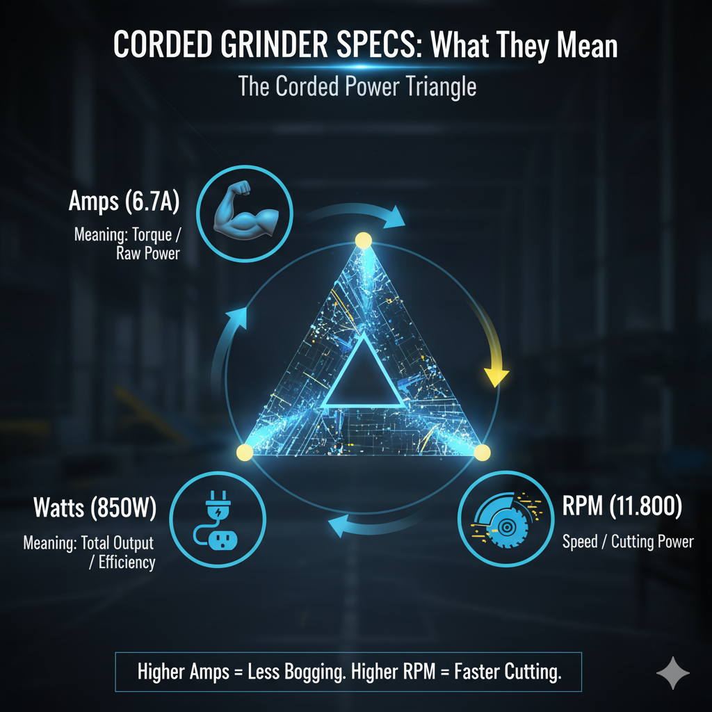 When comparing corded grinders, three numbers matter most. While Amps and Watts measure power, RPM measures speed.