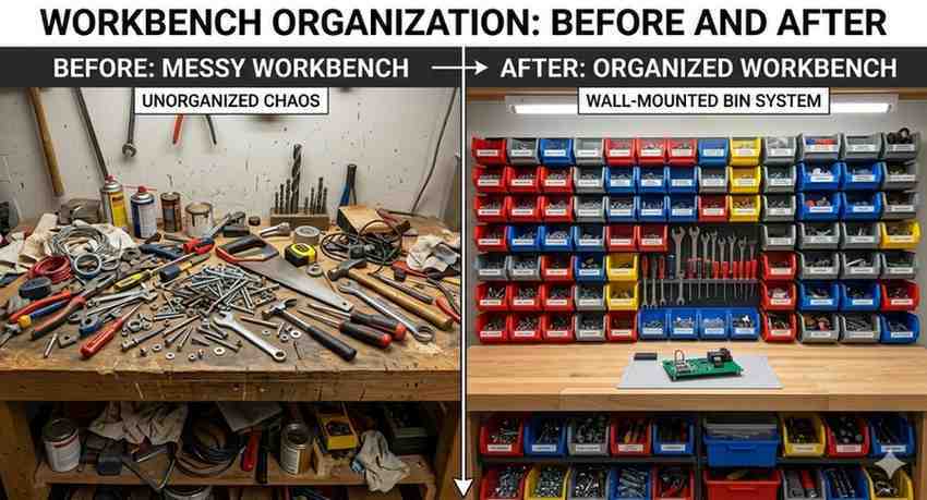 After: Your workbench is clear and ready for work. On the wall above it, your 30-bin organizer neatly displays all your small hardware. The red bins hold your metric bolts, the blue bins hold your wood screws, and the yellow bins hold your electrical connectors. Everything is visible, accessible, and exactly where it needs to be.