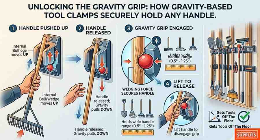 The magic of this tool organizer lies in its simple yet effective design. The rack features a series of clamps with rolling balls. When you push a tool handle into the clamp, the ball rolls up. When you let go, gravity pulls the tool down, causing the ball to wedge against the handle, holding it securely in place. To remove the tool, you simply lift the handle, and the ball releases its grip.