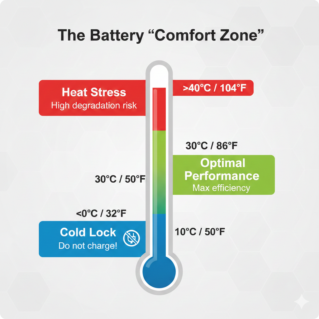 - Charging Freeze: Most BMS (Battery Management Systems) will prevent charging below 0°C (32°F) to prevent permanent damage.