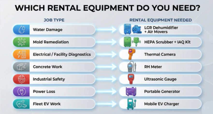 - 2025’s top rental categories include HEPA air scrubbers, LGR dehumidifiers, high-velocity drying fans, IAQ monitor kits, portable generators, mobile EV chargers, borescope cameras, concrete RH meters, and ultrasonic thickness gauges.