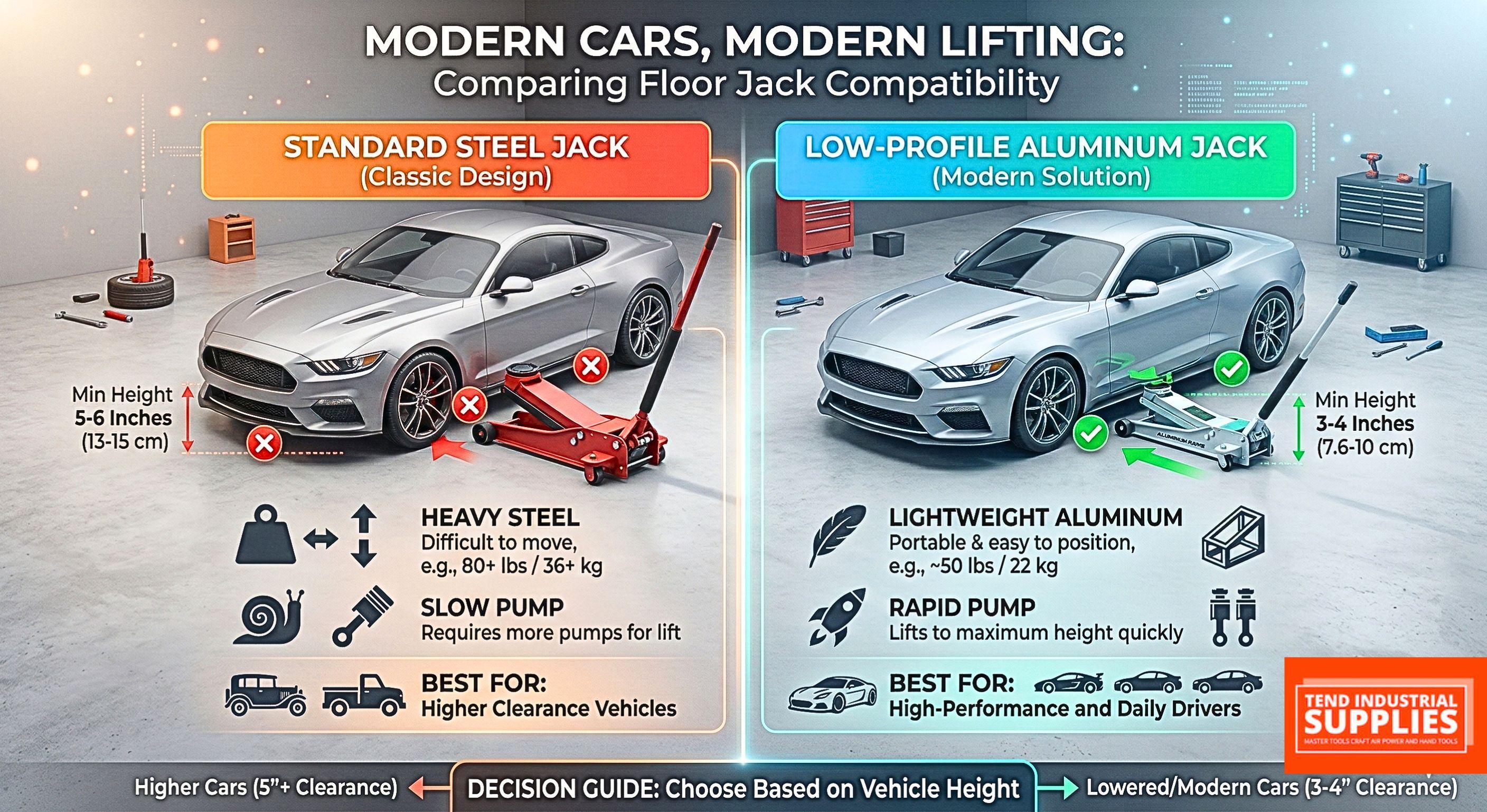 The right floor jack for modern cars is a low-profile aluminum model with rapid lift capability and built-in overload protection. A low saddle height (3–4 inches) ensures access under sports cars and sedans, while lightweight aluminum construction improves portability without sacrificing strength or safety.