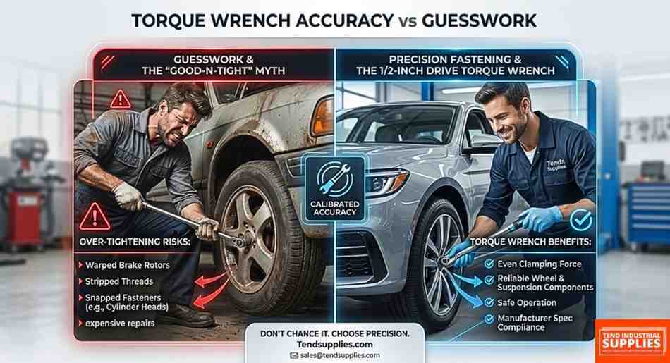 In automotive repair and mechanical work, the idea of tightening a bolt until it feels “good-n-tight” is a risky myth. A bolt that isn’t tightened enough can gradually vibrate loose and lead to serious mechanical failure. On the other hand, over-tightening can strip threads, snap fasteners, or warp critical components such as brake rotors and cylinder heads, turning a simple task into an expensive repair. The real solution is precision, and the tool designed to deliver that precision is the torque wrench. For any serious DIY mechanic or professional looking for a “1/2-inch drive torque wrench for proper fastening”, you understand that accuracy is not optional. It is the bedrock of safe and reliable automotive work.