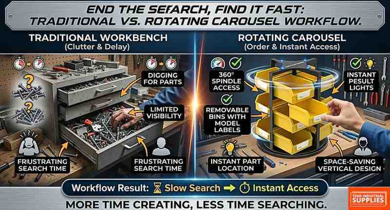 - 360-Degree Accessibility: Easily spin the carousel to find the exact component you need without having to dig through drawers.