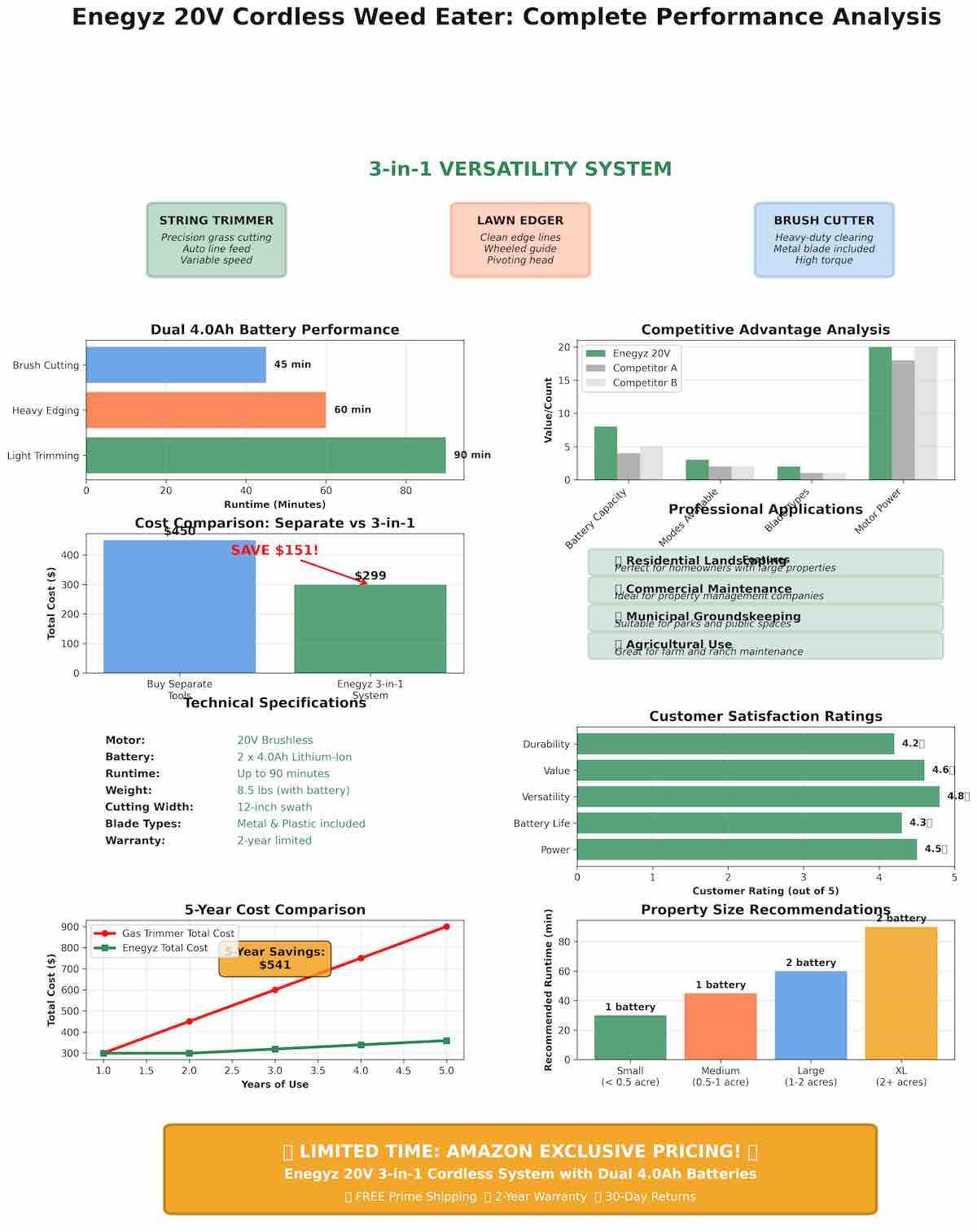 Are you tired of cluttered sheds filled with single-purpose yard tools? Frustrated with the limitations of traditional string trimmers that can't handle tough brush or create clean edges? The Enegyz 20V Cordless Weed Eater is here to revolutionize your yard maintenance routine with its powerful 3-in-1 design that combines a string trimmer, edger, and brush cutter into one versatile, high-performance system.