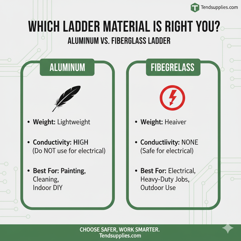 - Should I buy an aluminum or a fiberglass 5-step ladder? This depends on your tasks. Choose fiberglass if you will be doing any electrical work (like changing light fixtures or ceiling fans), as it does not conduct electricity. Choose aluminum if you only need a lightweight ladder for general tasks like painting, cleaning, or organizing, as it's much easier to carry.