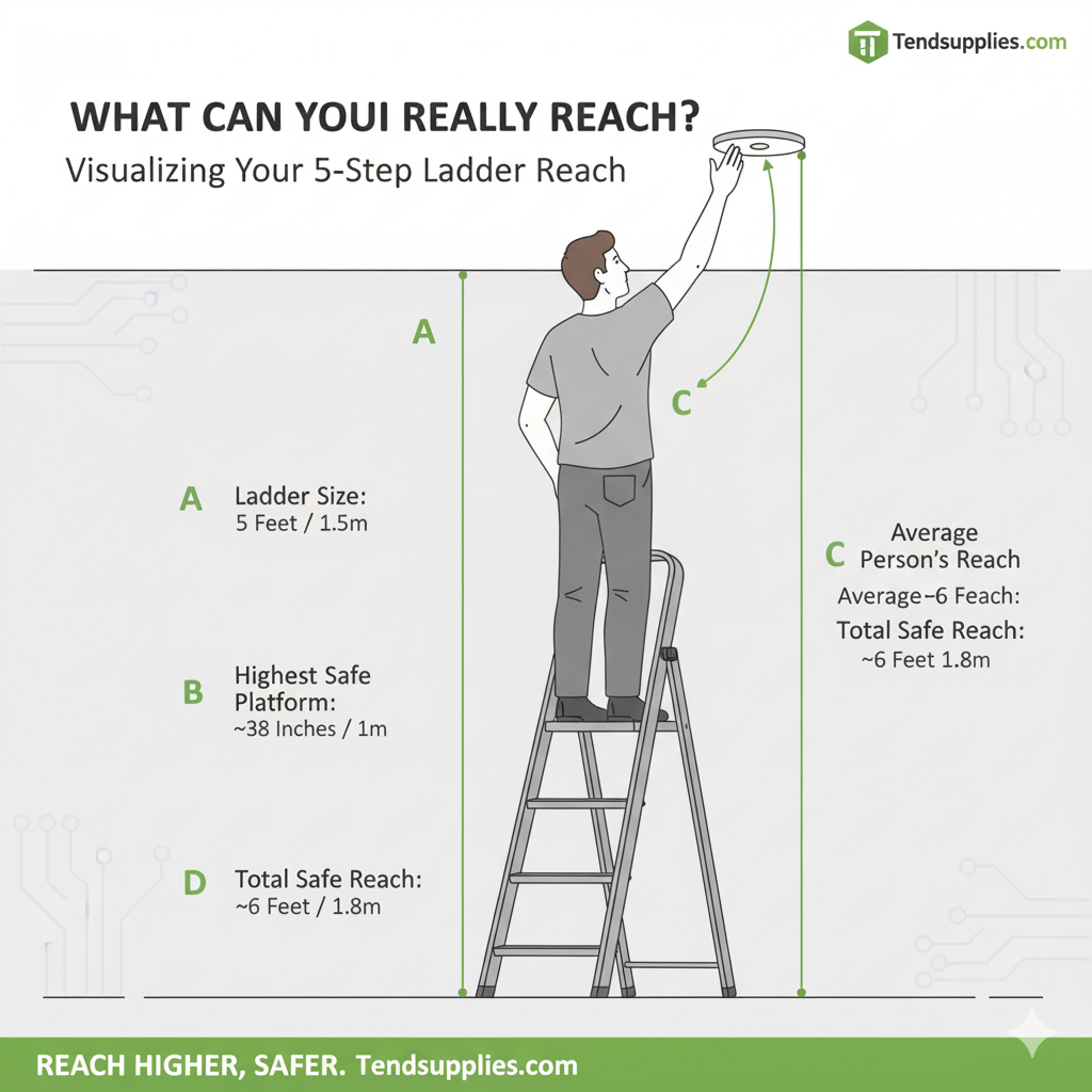 This is why we confidently say a 5-step ladder gives you a maximum safe working reach of 9 to 10 feet (2.7 to 3 meters). Shorter individuals may top out at 9 feet, while taller individuals can comfortably reach 10 feet.