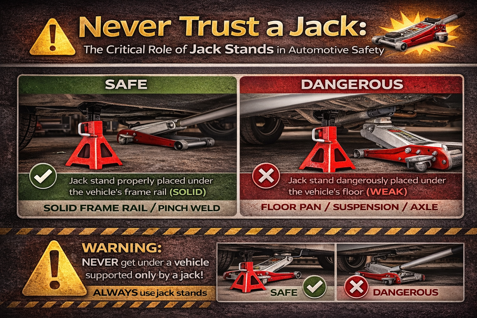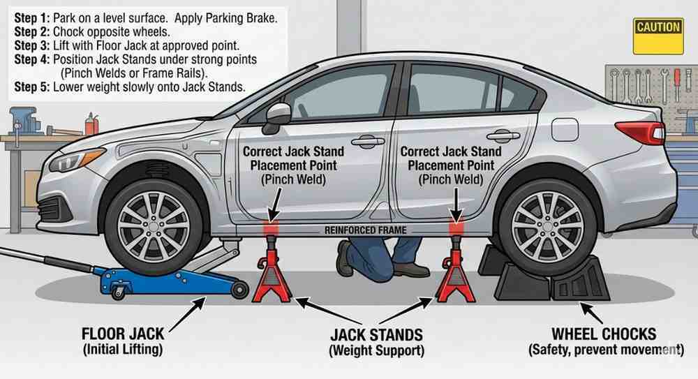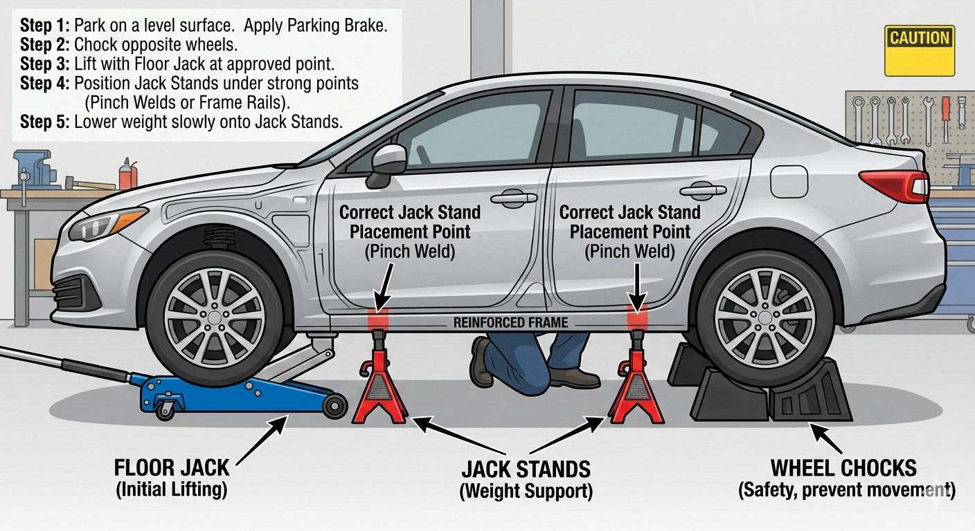 - The Golden Rule of Safety: Never work under a vehicle supported only by a jack. Always use jack stands.